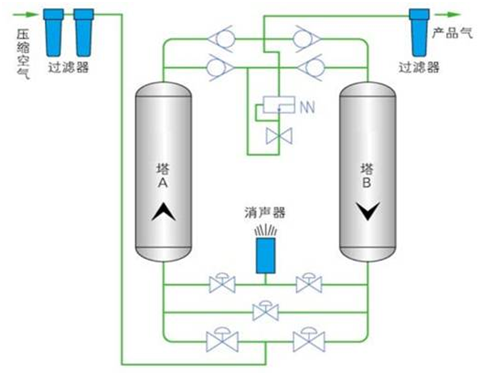 制氧系统主要由冷干机、空气冷却器、过滤器、空气缓冲罐、切换阀、吸附塔和氧气平衡罐、流量计等组成。(如下图)